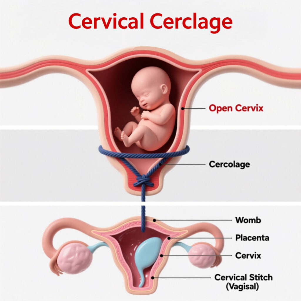 A cervical cerclage is a medical procedure in which the cervix (the lower part of the uterus) is stitched closed during pregnancy to prevent it from opening too early. This helps support the growing baby until full term.